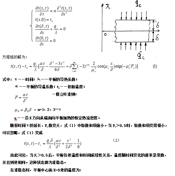 根據導熱微分方程式、初始條件和第二(èr)類邊界條件,對於任一瞬間沿(yán)平板厚度方向(xiàng)的溫度分(fèn)布t(x,τ)可由下麵方(fāng)程(chéng)組解得(dé);