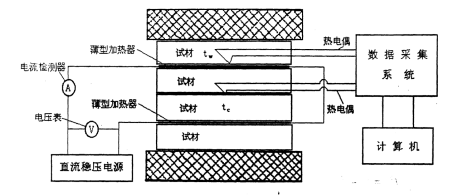準穩(wěn)態法熱物性測定儀內實驗本體由四塊厚度均為δ、 麵(miàn)積均為F的被測試材重疊在一起組成。在(zài)第一塊與第二塊試材之間夾著一個薄型的片狀電加熱器;在第三塊和第四塊試材之間也夾(jiá)著一(yī)個相同的電加熱器;在第二塊與第(dì)三塊試材交(jiāo)界麵中(zhōng)心和一個電(diàn)加熱器中心各(gè)安(ān)置一對熱電偶;這四塊重疊在一起試材的頂麵和底麵各加上一塊具有良好保溫特性的絕熱層。然後用(yòng)機械的方法把它們均勻地壓(yā)緊。電加熱(rè)器由(yóu)直流穩壓電源供電,加(jiā)熱功率由(yóu)計算機檢測。兩對熱電偶所測量到的(de)溫度由計算機進行采(cǎi)集處理,並繪出試材中心麵和(hé)加熱麵的溫度變化曲(qǔ)線。