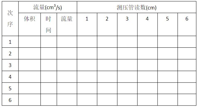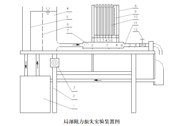 1.自循環供水器 2.實驗台(tái) 3.可控矽無極調速器(本裝置無(wú))4.恒壓水(shuǐ)箱5.溢流板6.穩水孔板 7.突然擴大實(shí)驗管段 8.測壓計(jì) 9.滑動測量尺 10.測壓管(guǎn) 11.突然收(shōu)縮實(shí)驗管段 12.實驗流(liú)量調節閥實驗管道由小→大→小(xiǎo)三種已知管徑的管道組成(chéng),共設有六個測壓孔,測壓孔1~3和(hé)3~6分別測量突擴(kuò)和突縮圓管的局部阻力。其中測孔1位於突擴界麵處,用於測量小管出口端壓強值。