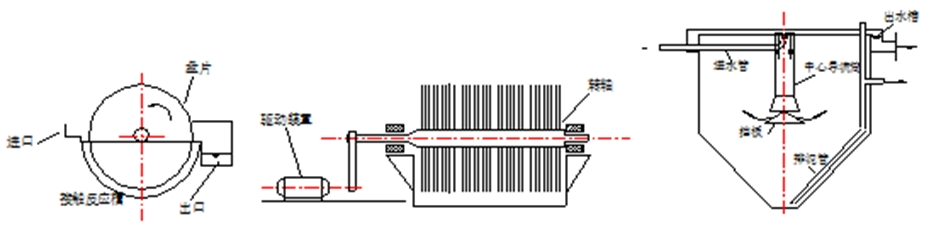 生物轉盤的構(gòu)造見示意圖。由電動機和減(jiǎn)速機帶(dài)動轉動軸,在水平軸上安裝一係列圓形盤片稱為轉盤。當生(shēng)物轉盤開始運轉時,應先培養生物膜。當運轉一個(gè)星期在整個盤麵上形成(chéng)一層生物膜。