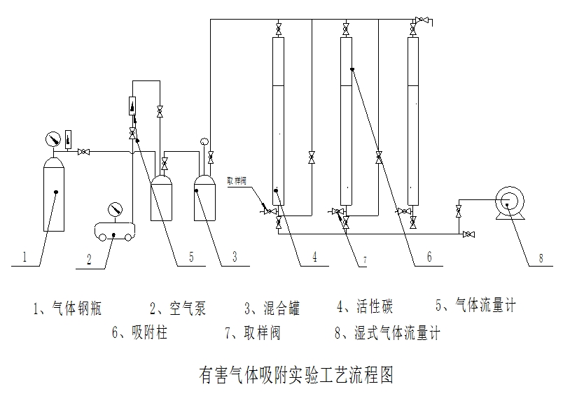 1.稱取活性炭100克,分別(bié)裝(zhuāng)入吸附柱內,按照流程圖按照儀器,並檢(jiǎn)查係(xì)統是否漏氣。