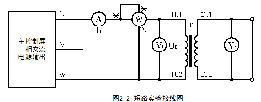 b.合上交流電源(yuán)綠色“閉合”開關,接(jiē)通交流電源,逐次增加輸入電壓,直到短路電流等於1.1IN為止。在0.5~1.1IN範圍內測取變壓器的UK、IK、PK,共取6~7組數據(jù)記錄於表2-2中,其中IK=IN的點(diǎn)必測。並記錄實驗(yàn)時周圍環境溫度(℃)。