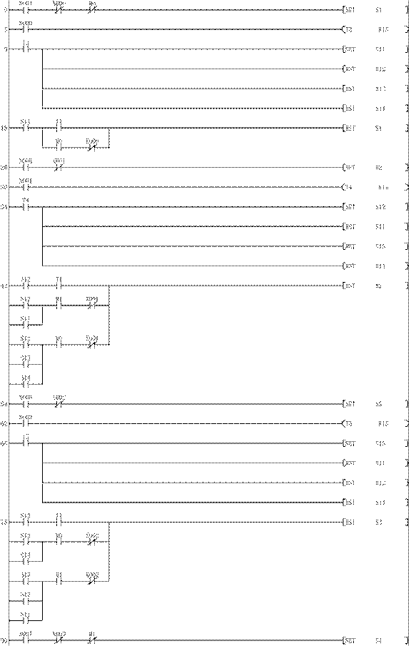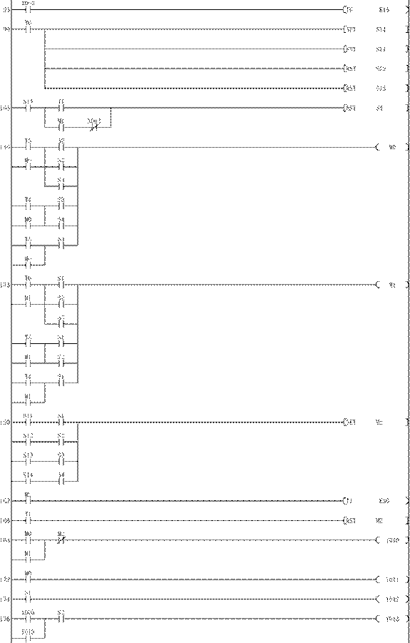 146 OR M1 147 AND S1 148 ORB 149 OUT M1 150 LD S11 151 AND S1 152 LD S12 153 AND S2 154 ORB 155 LD S13 156 AND S3 157 ORB 158 LD S14 159 AND S4 160 ORB 161 SET M2 162 LD M2 163 OUT T1 K30 166 LD T1 167 RST M2 168 LD M0 169 OR M1 170 ANI M2 171 OUT Y010 172 LD M0 173 OUT Y011 174 LD S1 175 OUT Y012 176 LD X005 177 OR Y013 178 AND S2 179 OUT Y013 180 LD X006 181 OR Y014 182 AND S3 183 OUT Y014 184 LD S4 185 OUT Y015 |
