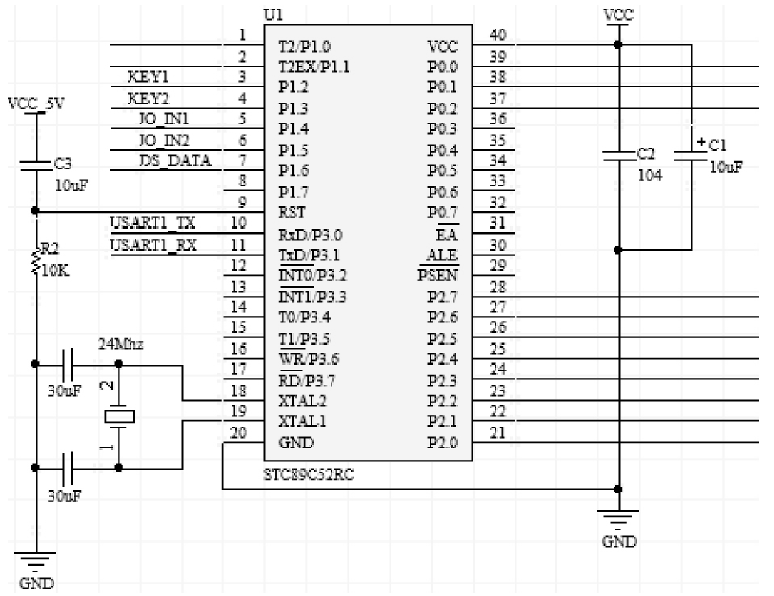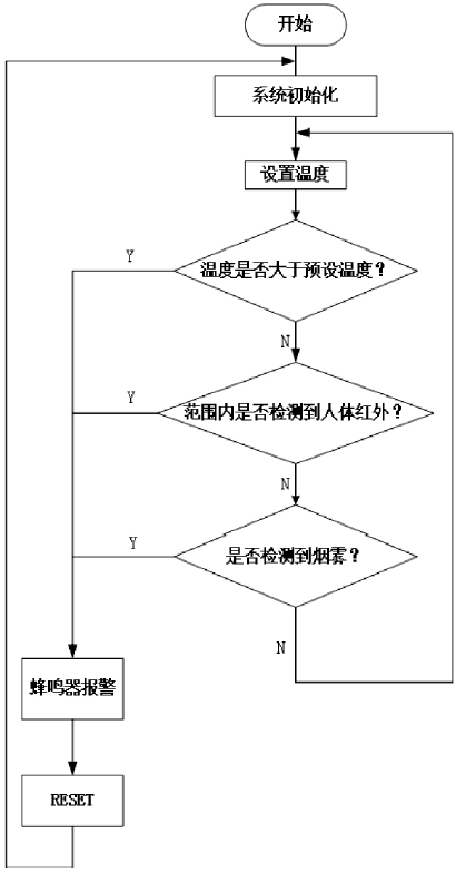 係統基於STC89C52RC單(dān)片(piàn)機控製,采用C語(yǔ)言編寫程序,由3個傳感器:煙霧傳感器、紅外傳(chuán)感器和溫度(dù)傳感(gǎn)器接(jiē)收信號,由蜂鳴器輸出報(bào)警信號,LCD顯示輸出實(shí)時溫度和預設溫度。本係統在係統軟件控(kòng)製下工作,HC-SR501人體紅外感應模塊接受(shòu)人體紅外輻射源的信號將所(suǒ)探(tàn)測到的信號進行放大、濾波,並從這些信號中提取出信息觸動(dòng)感應開關電子模塊,將結果反饋給主控單片機(jī)STC89C52。DS18B20溫(wēn)度采(cǎi)集器采集溫度信號傳送給可編程數字溫度計,對這些信號進行處理,若溫度高(gāo)於(yú)警示(shì)溫度,則將信號反饋給主控(kòng)單片機STC89C52。