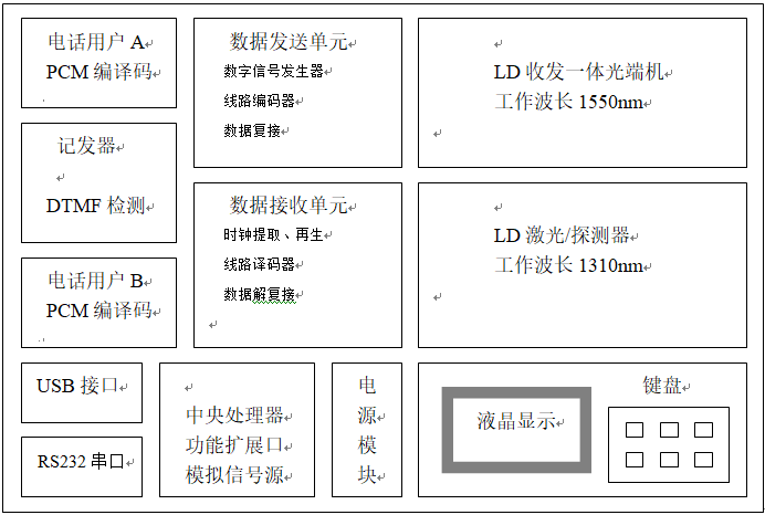 本實(shí)驗係統可分為電端機模(mó)塊、光通信(xìn)模塊、管理控製模塊、電源供(gòng)給模塊等四(sì)大功能模(mó)塊,每個功(gōng)能模(mó)塊又是由許多子模(mó)塊組成: