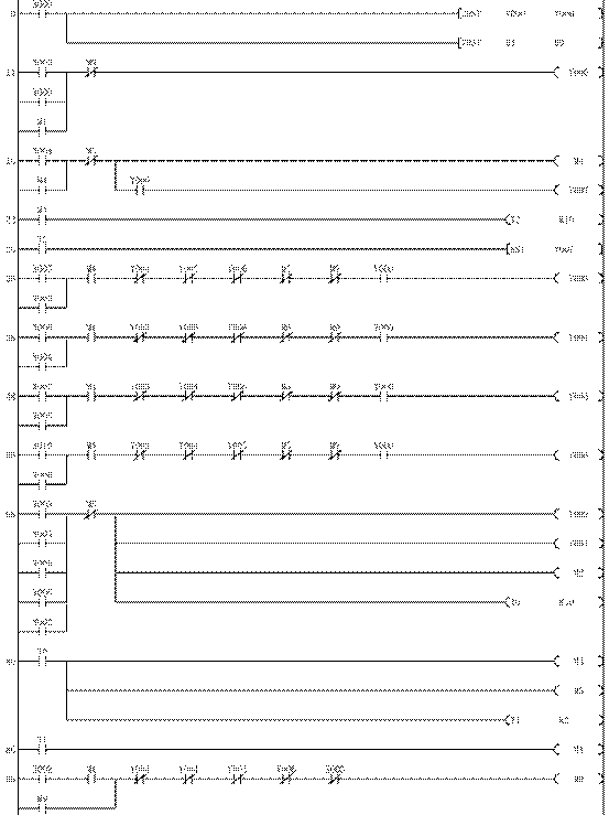 21 OUT Y007 22 LD M4 23 OUT T2 K10 26 LD T2 27 RST Y007 28 LD X005 29 OR Y003 30 AND M4 31 ANI Y004 32 ANI Y005 33 ANI Y006 34 ANI M5 35 ANI M9 |