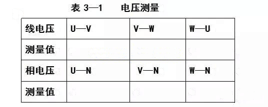 相電壓精確測量:選好數字萬用表工作電壓測量範圍(500V或1000V),將探頭各自測(cè)二根火線零線U、V;V、W;W、U將讀值填寫(xiě)表3—1中。