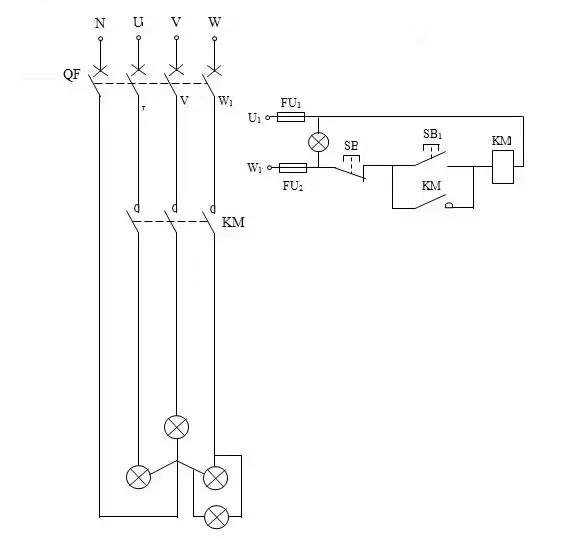從W1相考慮接斷路器FU2 FU2的小組出線接常閉按(àn)鍵SB SB的小組出線線接開與(yǔ)關(guān)按鍵SB1 SB1的(de)小組出線(xiàn)線接交流接觸器電磁線圈KM KM的小組出線線接斷路器FU1 FU1的小組出線線接U1相。將鎖緊KM開與關並在開與關按鍵SB一兩端。最終接顯示燈。