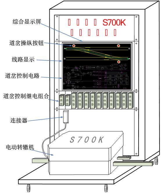 提速道岔S700K轉轍機(jī)大量用於城市軌道交通正線,實訓演(yǎn)練平台由信號組合櫃、信號繼電器、S700K三相交流電動轉轍機、線路及控製電路狀態顯示計算機、顯(xiǎn)示屏、多路數字量驅動采集模塊、24V電(diàn)源模塊、220V轉380V電源模塊、斷路器、道岔控製組(zǔ)合板(bǎn)、練功(gōng)平台(tái)車等設備組成。設備外觀結構如下圖(tú)所示。