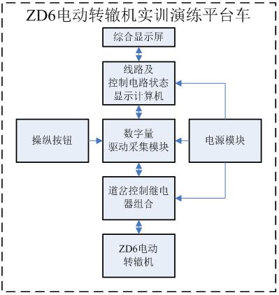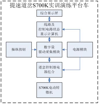 ZD6轉轍機實訓(xùn)演練平台通過道岔操縱按(àn)鈕(niǔ)接通道岔控製電路,控製ZD6轉轍機的定、反位的動作。在接通道岔(chà)啟動電路時、轉轍機轉換到相應(yīng)的位置並給出定/反(fǎn)位表示表示後,在綜合顯示屏上顯示繼電器線圈和接(jiē)點狀態,並連通相應(yīng)的表(biǎo)示電路,點亮對(duì)應(yīng)的表示燈。當轉轍機不到位或故障時,給(gěi)出相應(yīng)提示。此練功平台能使學員在較小的室內空間內實際操作和拆解轉轍機,達到身臨其境的感覺。同時通過道岔控製電路的實時(shí)顯示,直觀的反映電路的動作情況,從而達到常規(guī)現場(chǎng)教學無法達(dá)到的效果。平(píng)台各部件間接口如下(xià)圖(tú)所示: