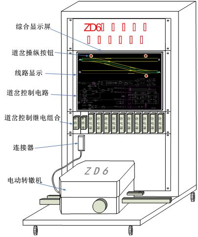 ZD6轉轍(zhé)機主要用於城軌(guǐ)車輛段,實訓演練平台(tái)由信號組合櫃、道岔控製組合板、信號繼電器、ZD6電動轉轍機、線路及控(kòng)製電路狀態顯(xiǎn)示計算機、顯示屏、多路(lù)數(shù)字量驅動采集(jí)模塊、24V電源模塊、直流220V道岔動作電源、斷路器、練功平台車等(děng)設備組成。設備外觀結構如(rú)下圖所示(shì)。