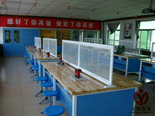 規格:2400×1200×750mm 台麵:采用40mm厚機製實木白樟子鬆(sōng)木板精致(zhì)加工,桌麵鋪設透明1.5mm厚橡(xiàng)膠防護墊,帶有二個獨立工具櫃,二個抽屜,有防護網;桌身:采用60*40mm方鋼烤漆骨(gǔ)架,配16mm優質三聚氰胺飾麵(miàn)板,三聚氰胺(àn)板為藍色。
