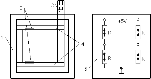 1─外殼 2─電阻應變片 3─測杆 4─等截麵懸臂梁(liáng) 5─麵板接(jiē)線圖