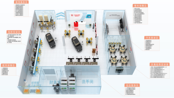 基礎建設設施:整體按4S店的模式進(jìn)行建設(shè),功能分區科學合理(lǐ),分為(wéi)銷售接待區、業務洽談區、售後服務區、整車檢測診斷區、汽車維修區等;