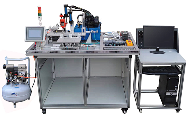 主要由實訓工作台、上料單元、間歇(xiē)式傳送及夾(jiá)緊單元、衝壓單元、鑽孔單元、分揀單元等部分(fèn)組成。
