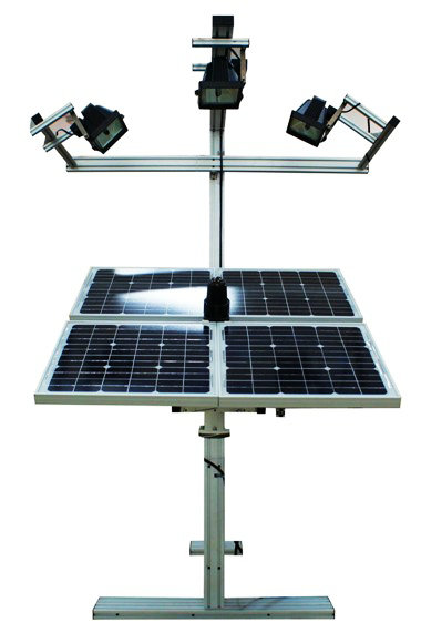 光源模擬跟蹤控製係統控製燈光來模擬太陽光源(晨日太(tài)陽、午日太陽、夕日太陽)的(de)運行軌跡以(yǐ)及太陽光的(de)入射角度,太陽能電(diàn)池板上的(de)模擬追(zhuī)日跟蹤傳感(gǎn)器采集模擬太(tài)陽光照度信(xìn)息及位置信息,控製兩維運動(dòng)機構,使(shǐ)太陽能電池板始終正對著模擬太陽光(guāng)源,以提高太(tài)陽能電池的(de)發電效率。
