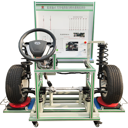 (比亞迪e5 EV450純電動汽車) 動力轉向控製電腦(ECU)、診斷座、點火開關、前橋(qiáo)懸掛機構、方向盤、轉向柱、電動助力方機、轉向拉杆、前左右車輪總成(chéng)、信號模擬裝置、扭矩傳感器、扭矩(jǔ)傳感器信號電壓數顯表、故障模擬(nǐ)與排除裝置、前輪左右轉盤、一體化全鋁(lǚ)合金型材搭建的移動(dòng)台架(1500×1000×1700mm ,帶自鎖腳(jiǎo)輪(lún)裝置,帶安裝檢測端子的(de)原理麵板948×898mm)、設備操作說(shuō)明書。