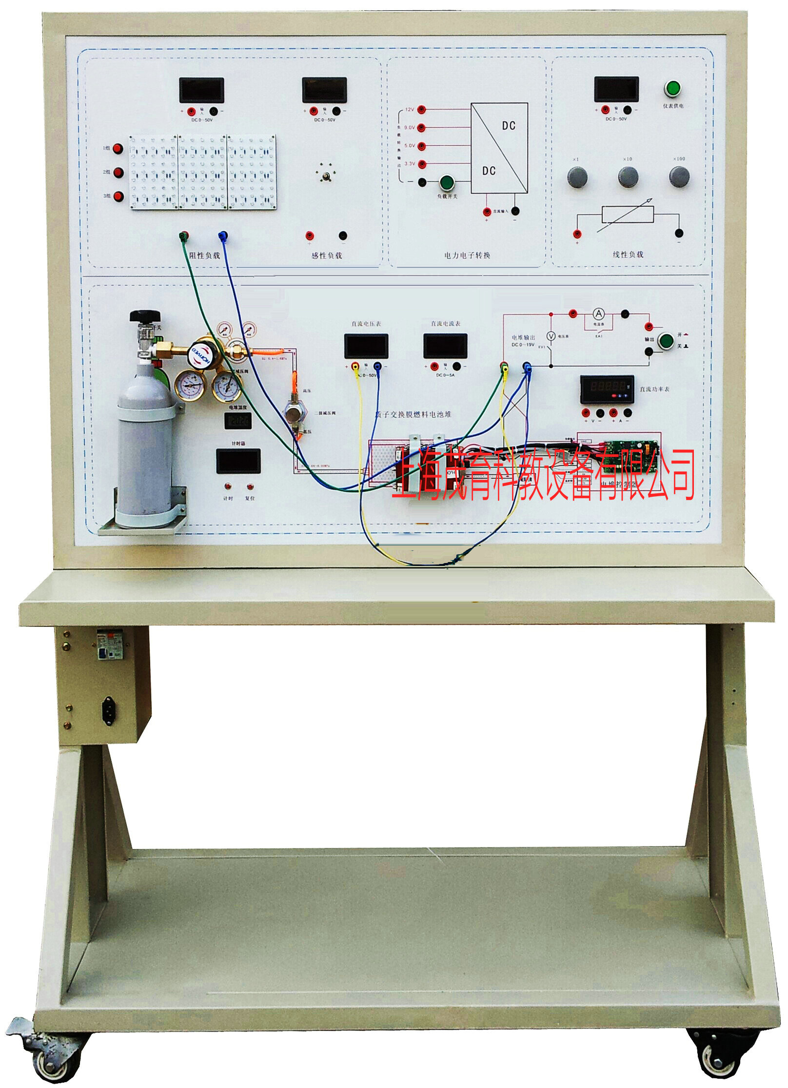 示教板采用點(diǎn)火開關、燃料電池(氫氣)、直流電動機、發光二極管組(zǔ)件、製動開關等。12V開關(guān)電源、大型彩色噴繪電路原理圖、控(kòng)製麵板、可移動台架、使用說明(míng)書及實訓指導書等。